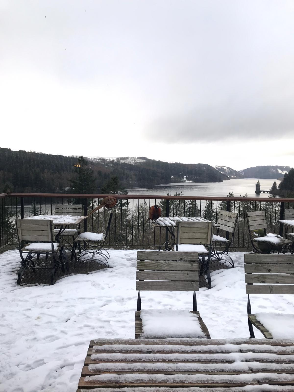 The approach and landing was the most challenging to date and leaves little room for error. Having Doug on hand was a godsend and once into the hover and spot turned to face out over the lake, the view was breathtaking. I touched us down into the snow and shut down for some lunch. We ate in the Brasserie overlooking the surroundings, with pheasants within arms length on the balcony outside.
