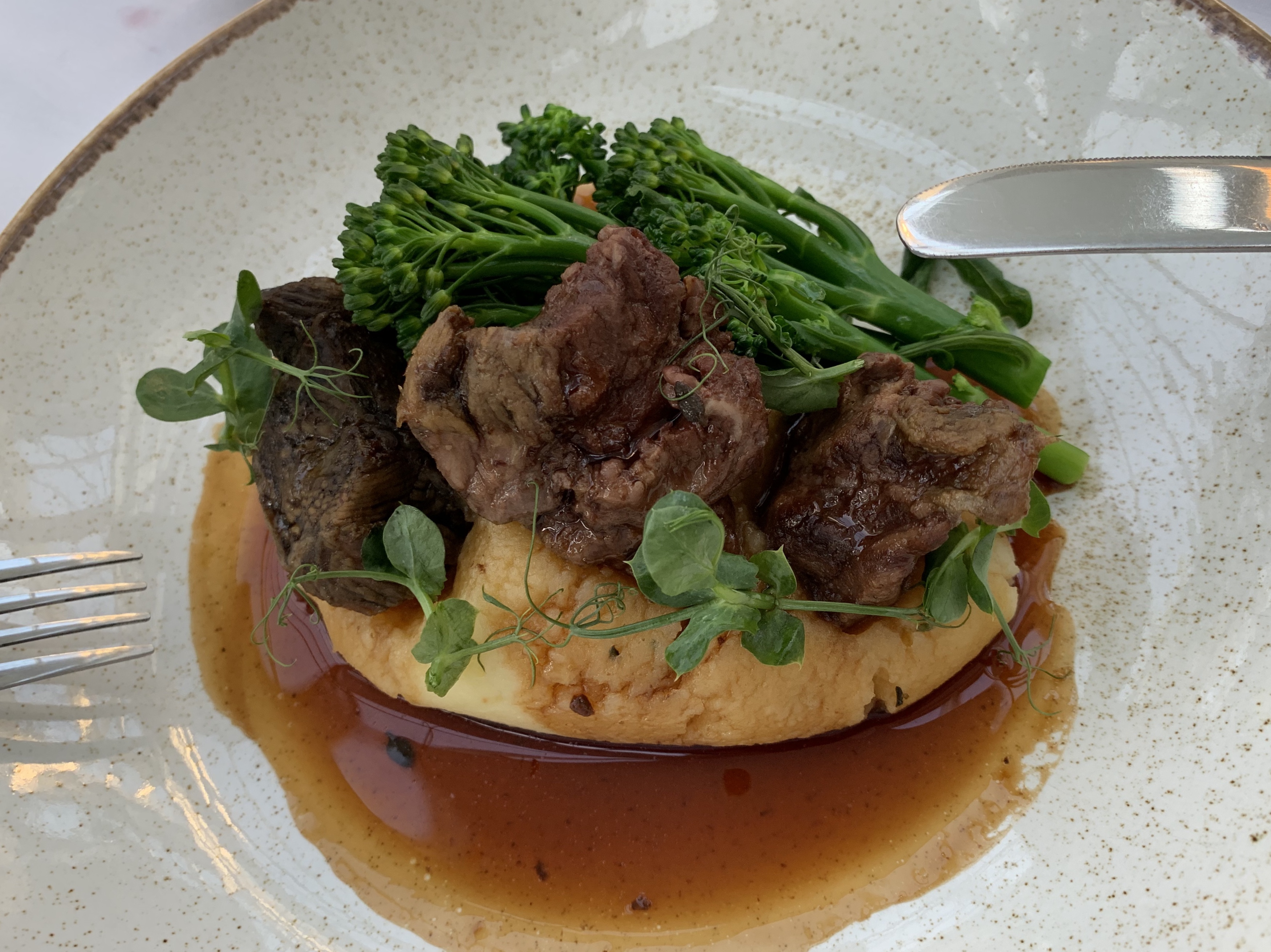 My room had been upgraded from a single, to a superior double and with a view overlooking the helipad, I couldn’t have asked for more. I signed in and headed up to the room. A super king 4 poster, sofa, arm chair and all you could ask for. I was super content. I completed the Techlog, took the Telegrpah outside to read in the sunshine, showed people around the R22, and then headed off for dinner. The food looked promising and the menu didn’t disappoint.