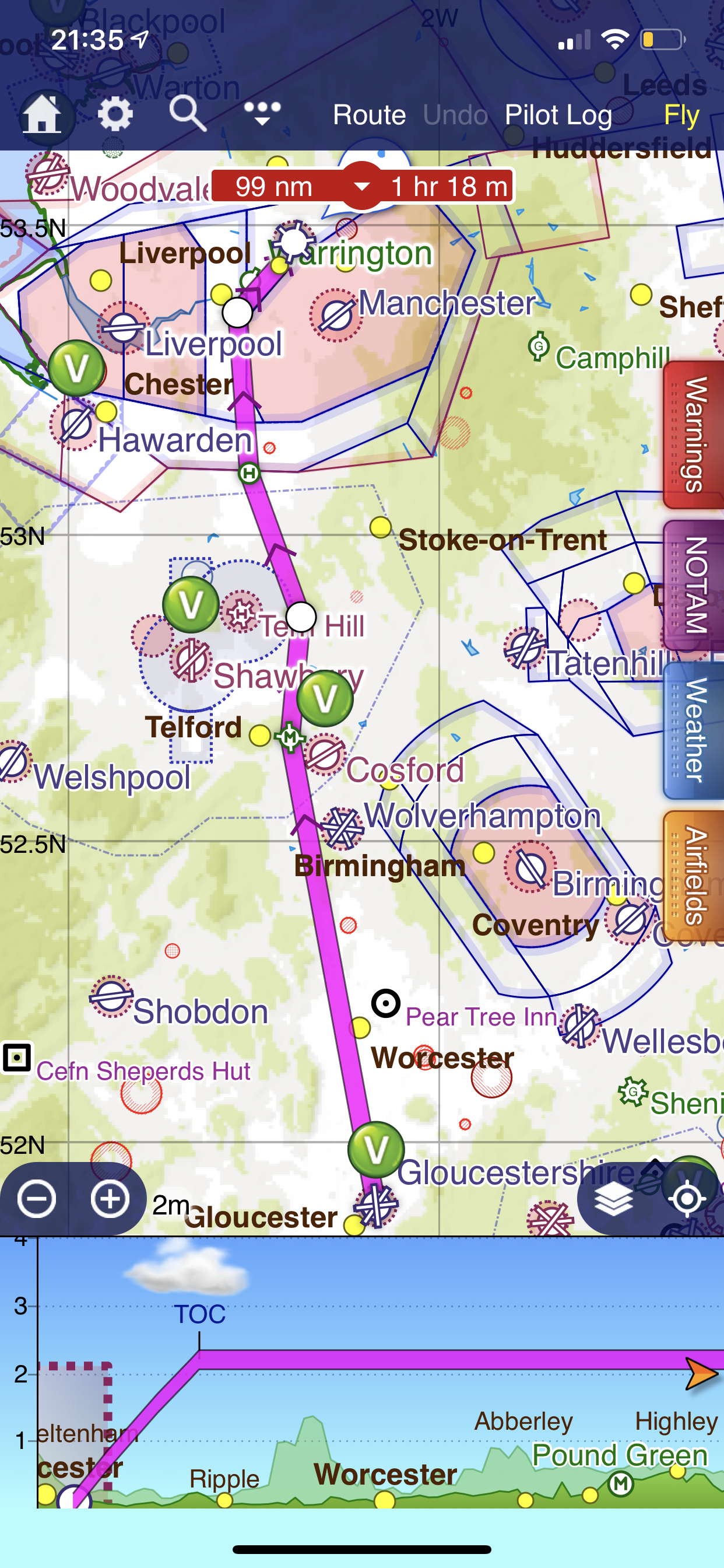 I had planed the route on SkyDemon meticulously, booked out, checked the fuel for the duration with enough for a good reserve, and headed out. I had G-OASH for the whole weekend, I put my overnight bag in the footwell of the passenger side, frequencies list on the seat and started up. It was a nice day in Gloucester, with some rain forecast between 10 and 11 in Manchester but nothing to stop play. I headed out to the North, setting a course for 310deg which would take me to the West of Worcester and Wolverhampton, East of Shrewsbury and a direct line to access the Low Level Corridor at Chester.